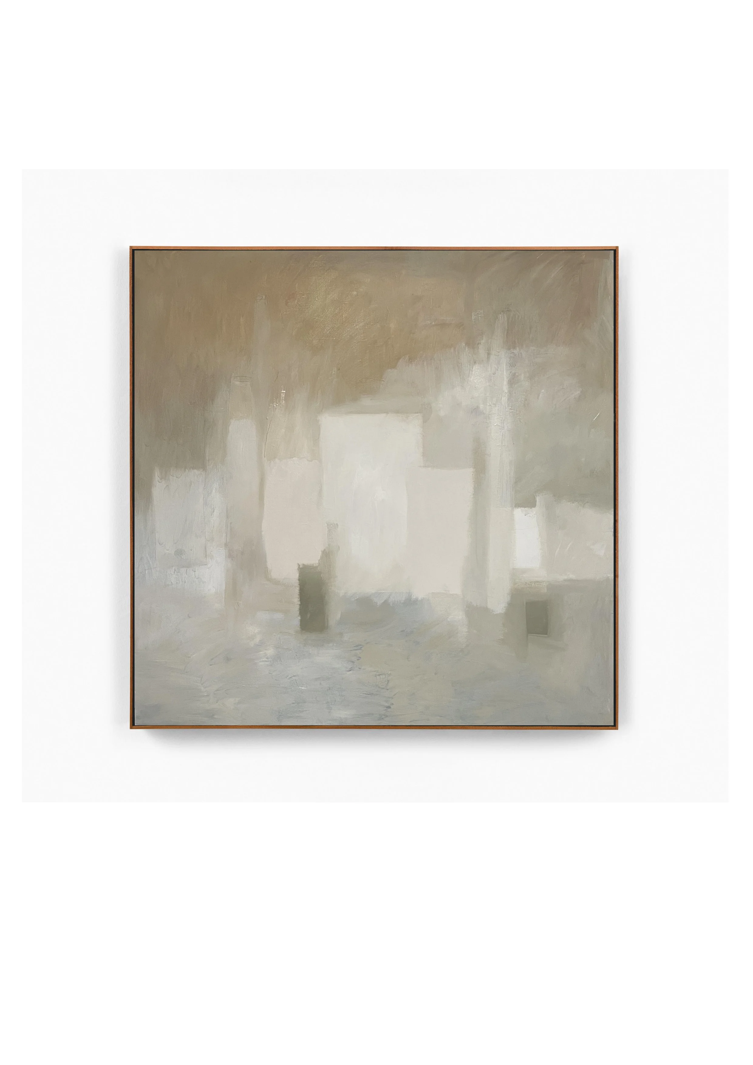 The paint is layered and there are often ghosts of previous compositions revealed by thinner layers. These ghosts will often take the painting in a new direction. She uses a palette of muted, almost dirty colours, which sing harmoniously.